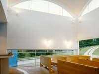 Pequeno deslocamento da nave quadrada orienta seu eixo leste-oeste, com uma cruz em vidro atrás do altar, para o nascer do sol em 29 de setembro, dia de São Miguel, orago da capela.