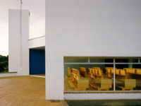 Pure geometry and orientation axes are used and the chapel is located on a high spot, dominating the surrounding landscape. Square and cube (the visible world) and circle and sphere (the spiritual one) compose the building geometry, entirely articulated by the Golden Section proportion.