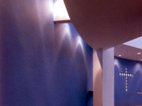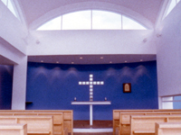 A small dislocation of the nave square, regarding the east-west axe, orientates the apse glass cross to the sunrise of September 29, Saint Michael’ day.